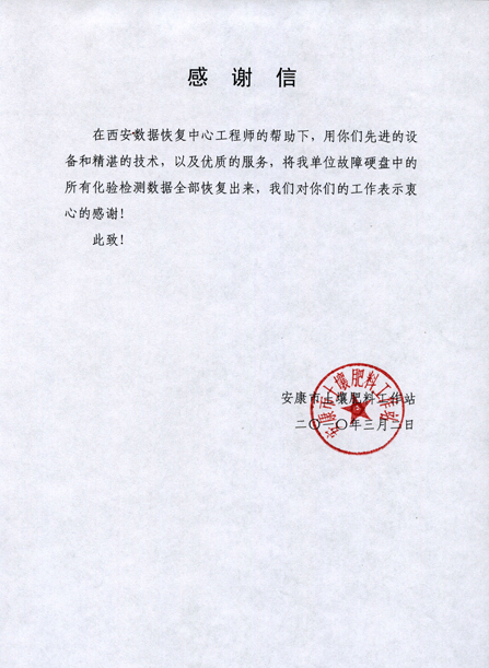 安康市土壤肥料工作站 客户感谢信 西安数据恢复中心